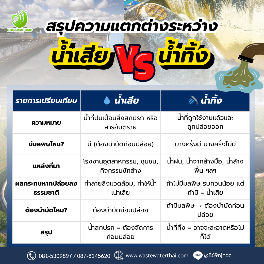 น้ำทิ้งบางชนิดอาจยังไม่ถือว่า “น้ำเสีย” ถ้าไม่มีสารอันตราย แต่หลายครั้ง น้ำทิ้งก็คือน้ำเสีย ถ้าปนเปื้อนสารต่าง ๆ